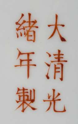 the body decorated with polychrome butterflies on white ground, the foot with lappet border, the shoulder with flowers amongst scrolling branches and leaves within gilt collar, the neck with further butterflies and ruyi border to the rim, Guangxu six-character mark to the base