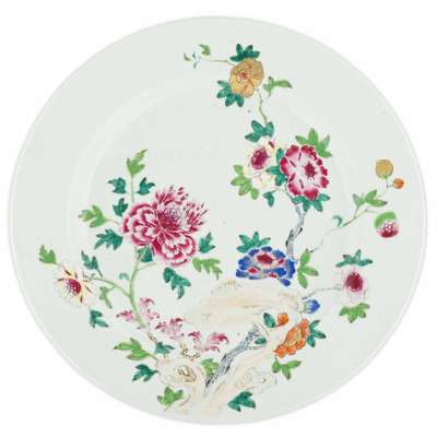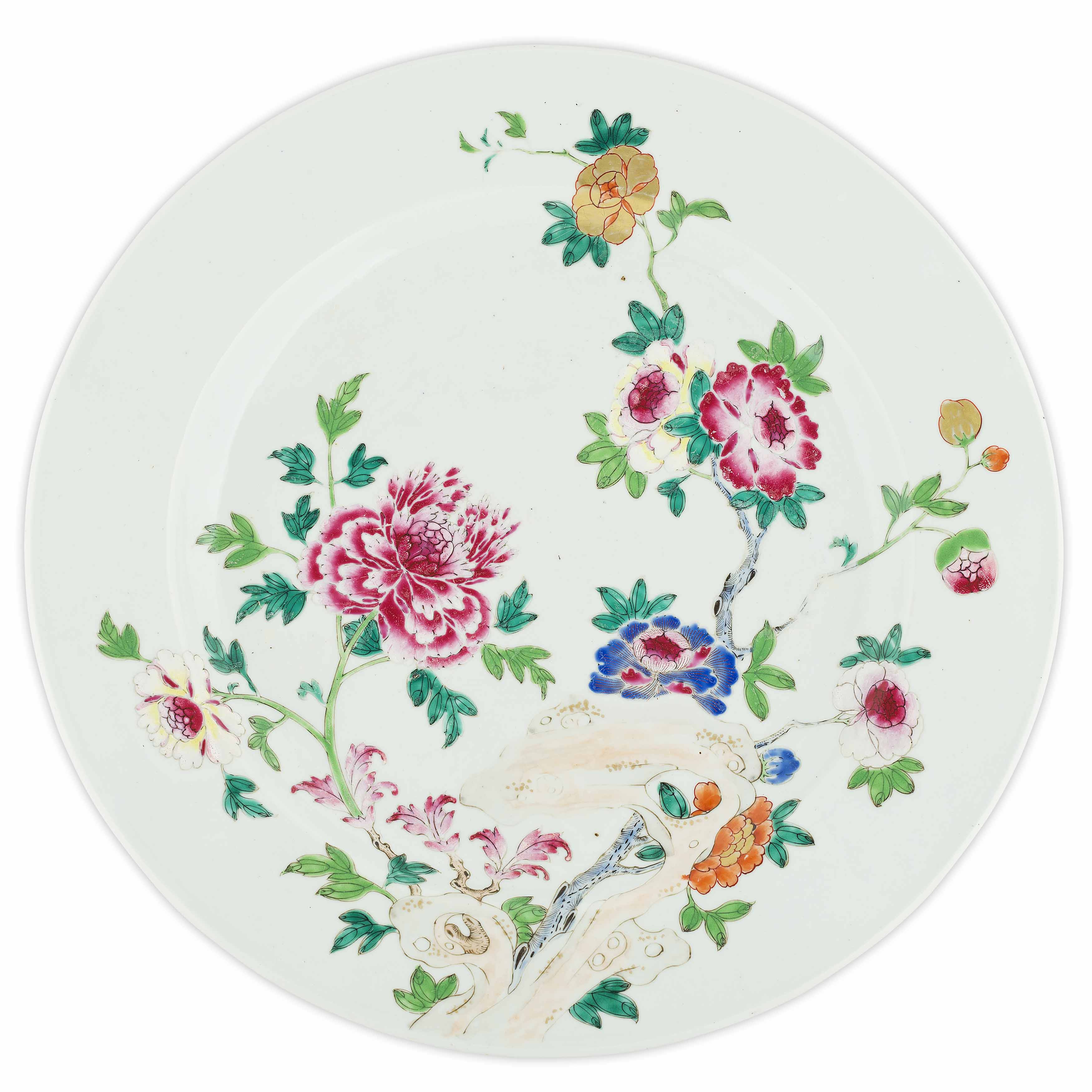 finely enamelled with two branches of flowering peonies stemming from an intricate scholar's rock
