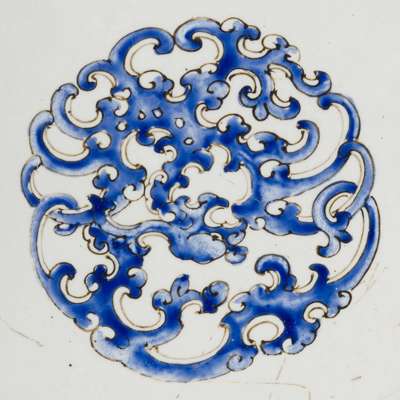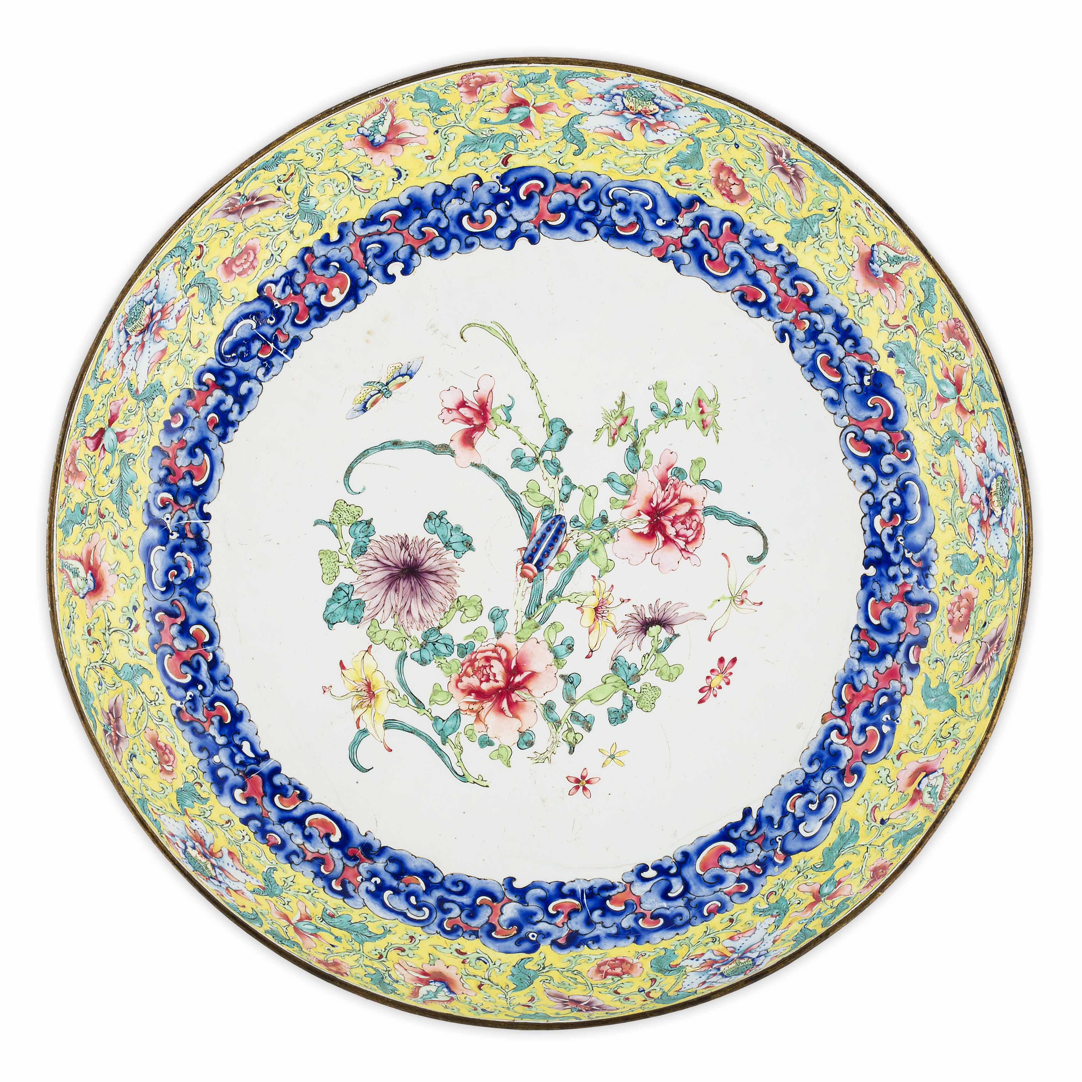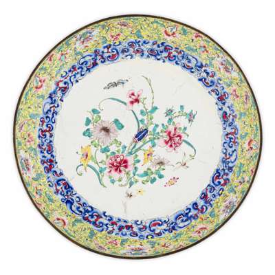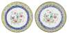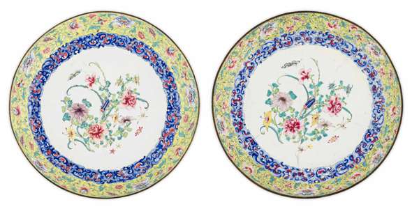 each painted at the centre with a large spray of composite flowers, with a beetle perched in the middle, encircled by a band of blue-coloured 'dragon and cloud' scrolls below a border of rich floral scrolls on yellow ground, the exterior painted with stylised blue dragons on white ground (2)
