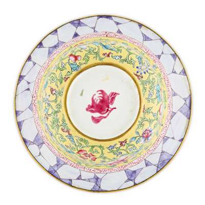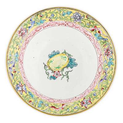 the exterior and the interior of the flaring mouth rim luxuriantly decorated on a yellow ground with floral blooms on leafy scrolls, the centre of the interior and of the bottom decorated with a pomegranate fruit (2)