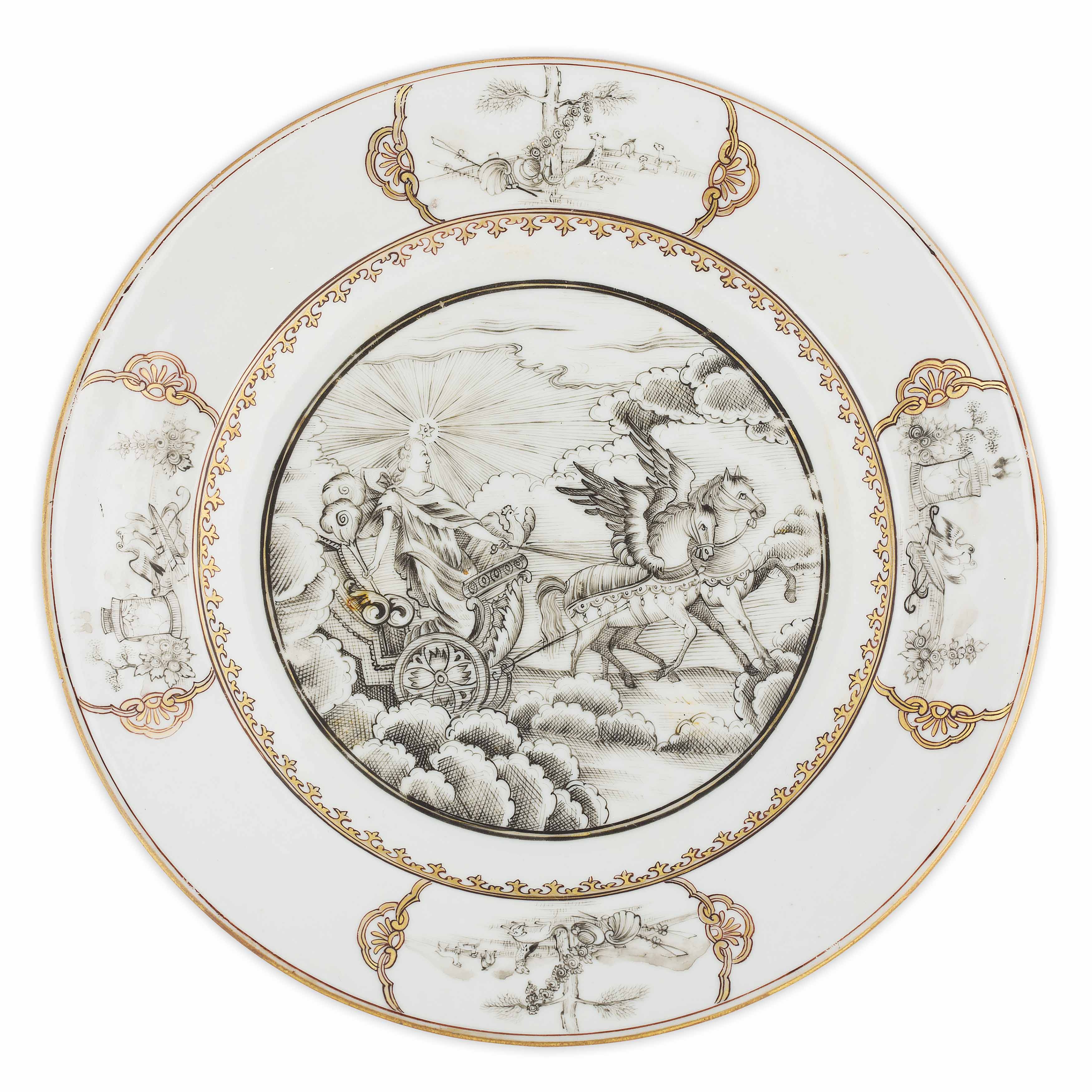 See Hervouët and Bruneau, La Porcelaine des Compagnies des Indes à Décor Occidental, Paris, 1986, p. 294, fig. 13.10 for a very similar plate. An armorial version with the arms of Humbertson is illustrated by D. S. Howard, Chinese Armorial Porcelain, London, 1974, p. 334.