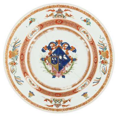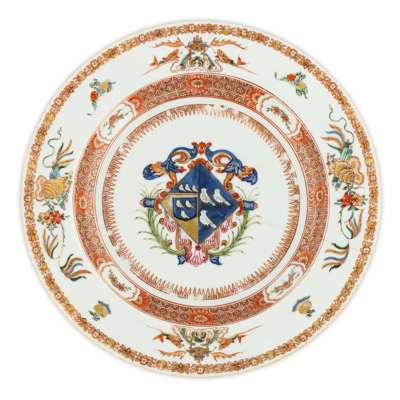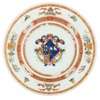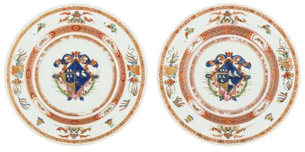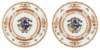 centrally enamelled with a coat-of-arms of cockatoos, borne on a rose enamel ribbon, within a band of floral pattern with four cartouches, beneath a band of clumps of auspicious objects and blossoms to the rim (2)