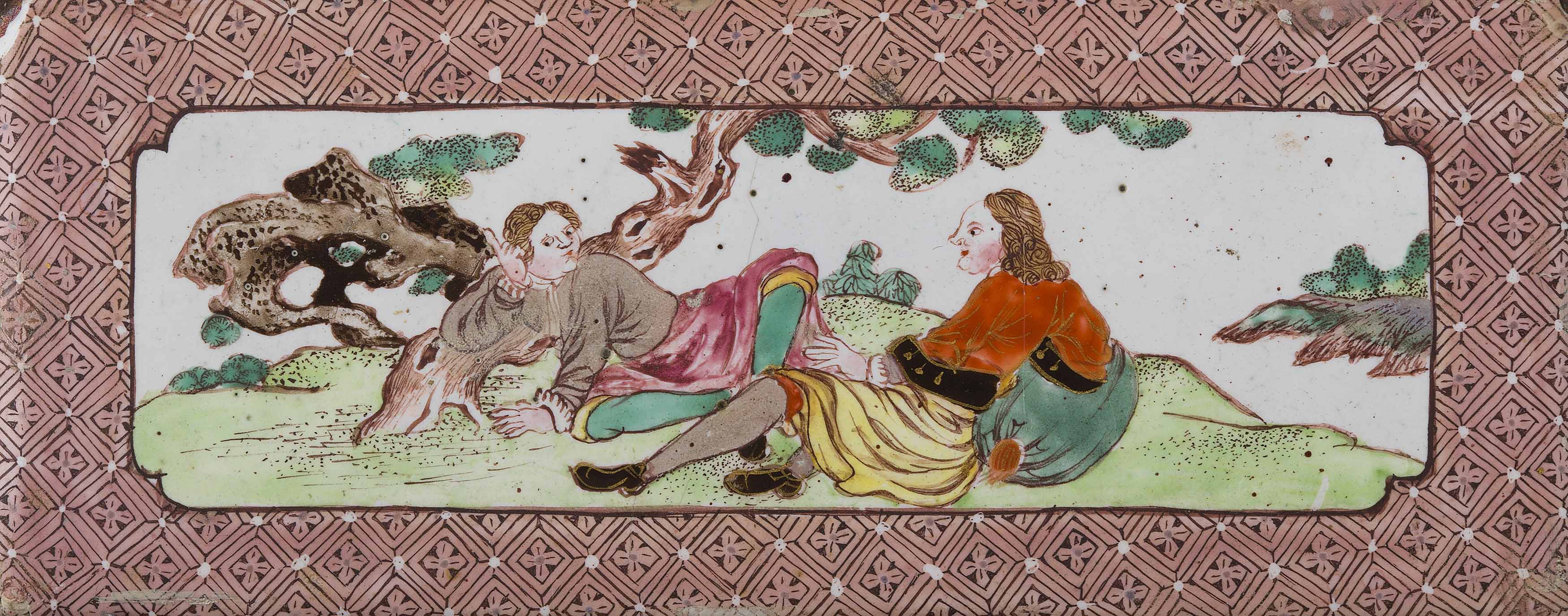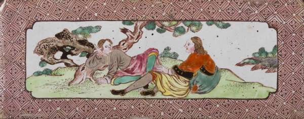 of rectangular form, depicting two gentlemen dressed in European fashion sitting conversing beneath a pine tree, all reserved on pink floral diaper ground, on stand