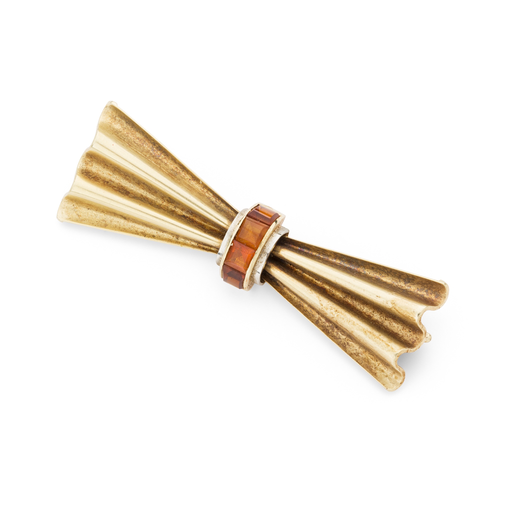modelled as a bow, channel-set to the centre with calibre-cut citrines, stamped 585, in a fitted box for Heming & Co ... London