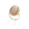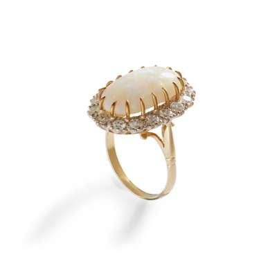 claw-set with an oval cabochon opal, in a single border of round brilliant-cut diamonds, stamped 18CT