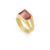 collet-set with a rectangular-cut pink tourmaline, pierced detail to shoulders, brushed finish 18ct gold mount