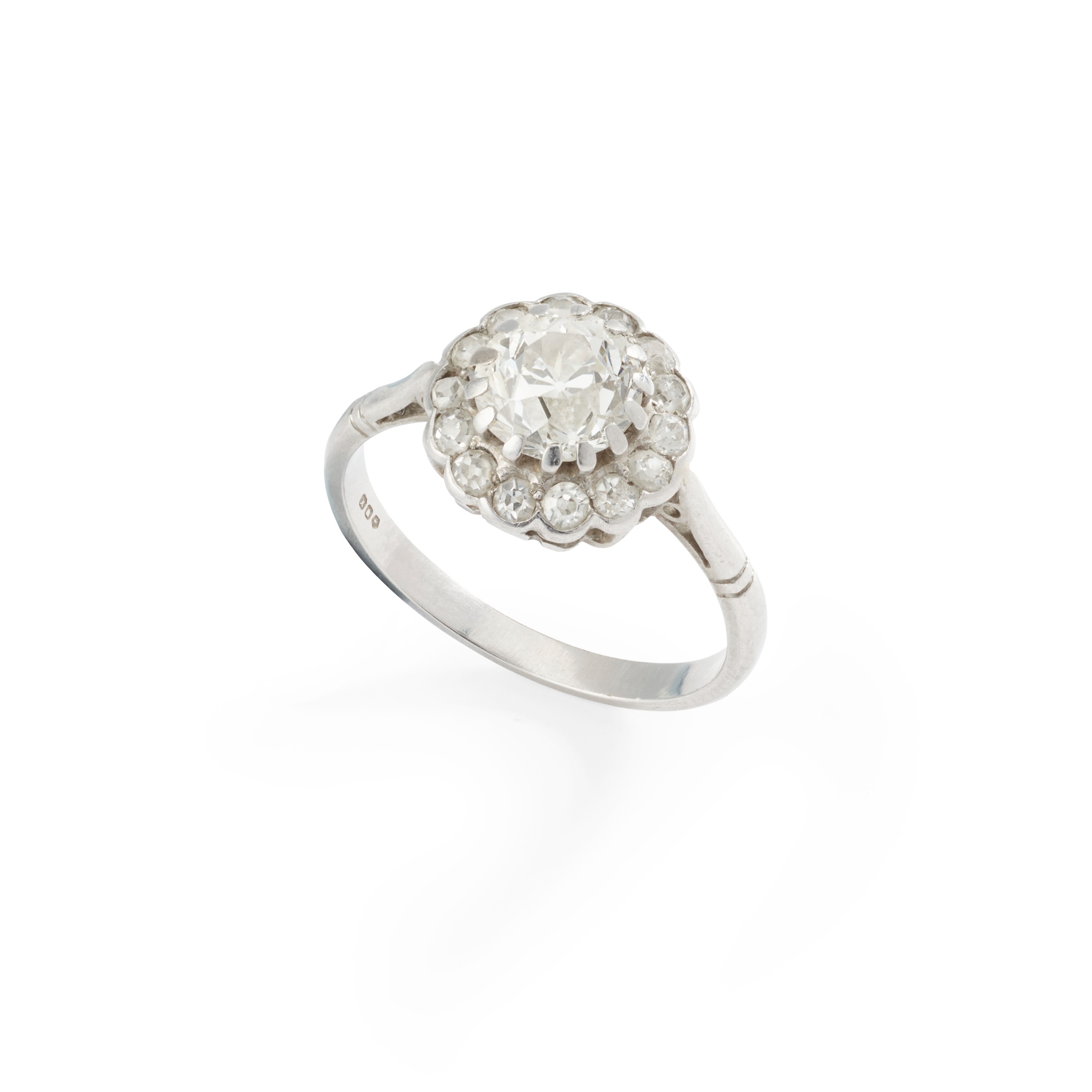 claw-set with an old round-cut diamond, in a border of old round and eight-cut diamonds, mounted in platinum