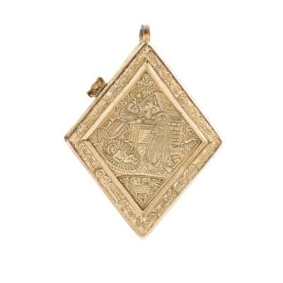 The reverse shows the Nativity with the Lamb of God, in a border of fifteen saints, some of which have been identified, such as St Peter, St George, St Anne etc. The original pendant opened to reveal a hidden compartment, identifying the piece as a reliquary. When it was discovered, it contained three small discs of silk embroidered with golden thread, which may have come from a Bishop's cope, soil and roots; but it may originally have held an important religious relic. Various holes around the edge of the pendant also suggest that it may have included a border of pearls, and there is still some trace of blue enamel, hinting at a more colourful original.