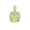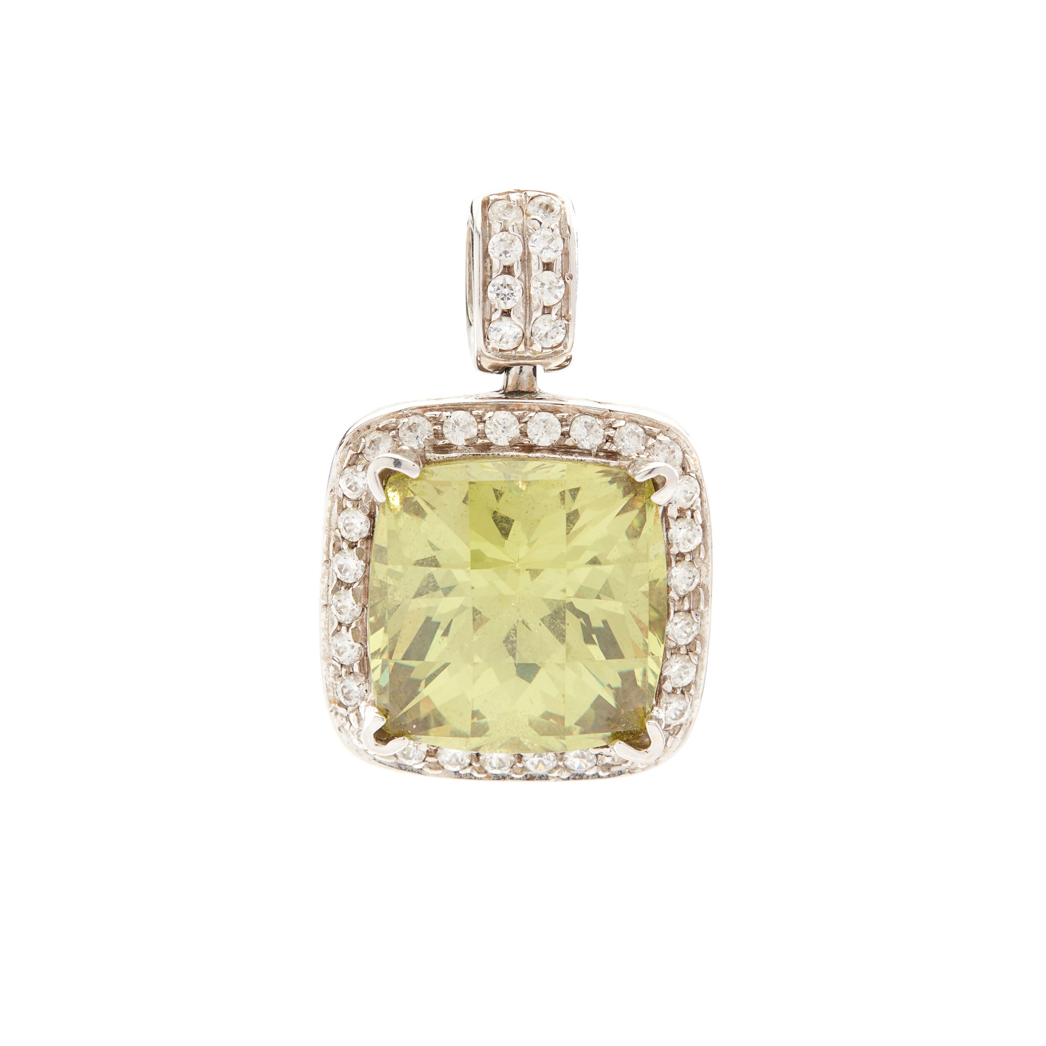 claw-set with a fancy cushion-cut yellowish-green gem, in a border of round brilliant-cut diamonds, unmarked