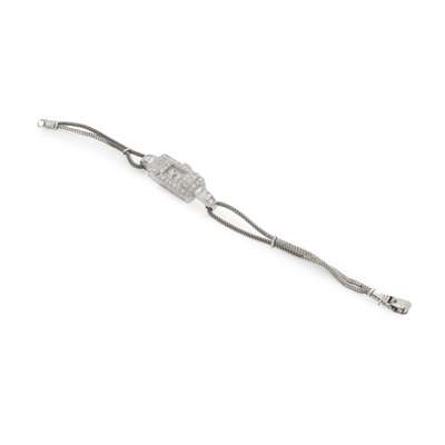 the rectangular dial with Arabic numerals, the case pavé-set with eight-cut diamonds and channel-set baguette-cut diamond detail, to a woven mesh strap and fold-over clasp, unmarked