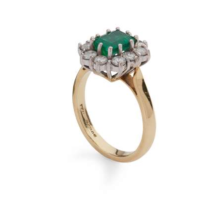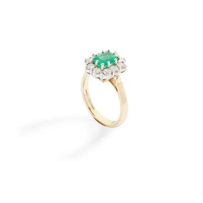 An emerald and diamond cluster ring
