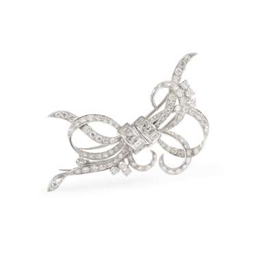 of scrolling design, channel-set with two central rows of square step-cut diamonds and throughout with graduated eight-cut and round brilliant-cut diamonds, unmarked