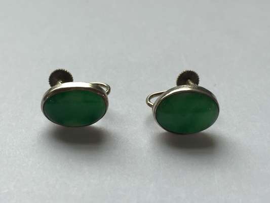 including a necklace composed of five pierced and carved oval jade panels, to a belcher link chain, unmarked; a rectangular carved jade panel brooch, unmarked; and a pair of polished cabochon jade earrings, screw fittings, unmarked