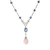 the chain of filigree detail, collet-set at intervals with round-cut sapphires and pearls, suspending a millegrain-set cushion-cut sapphire and a polished rose quartz drop