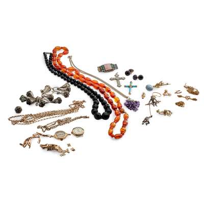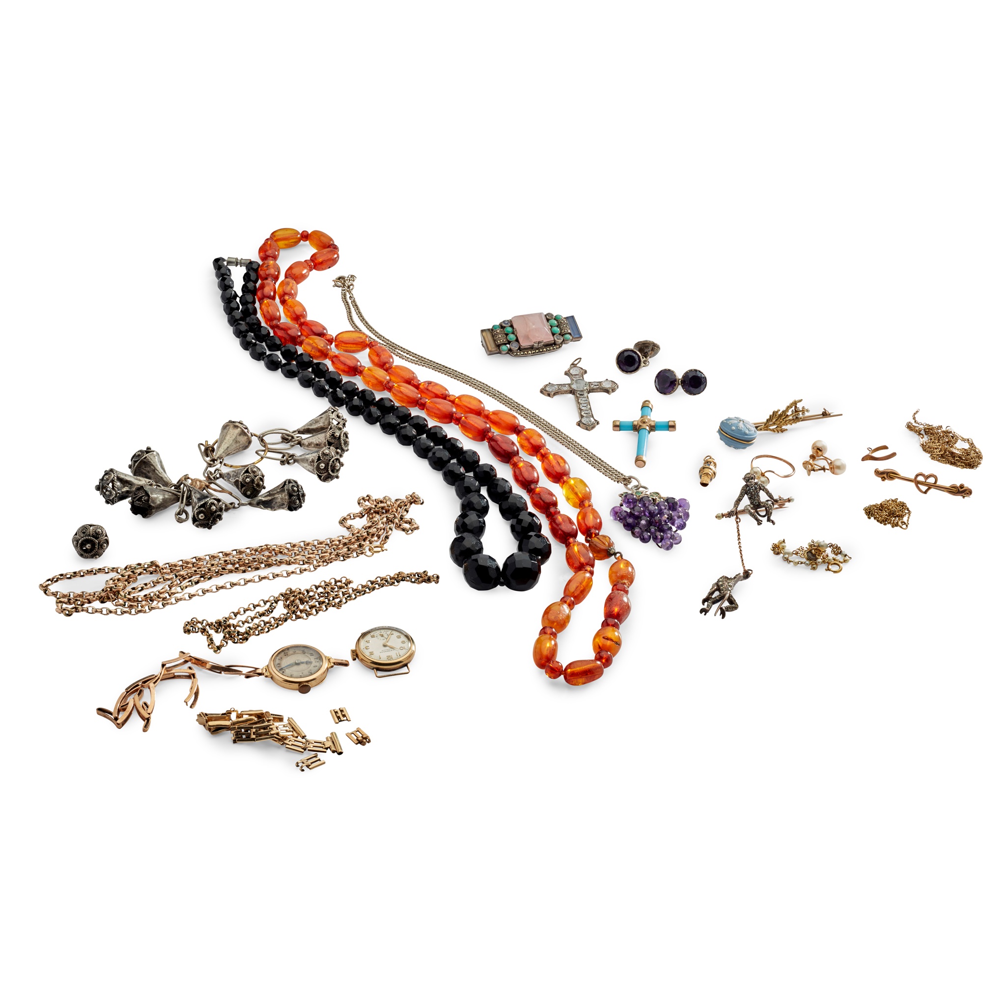 including two lady's wristwatches, a Victorian paste set monkey brooch; a Georgian enamelled whistle charm, various bar brooches, pendants, beaded necklaces etc.