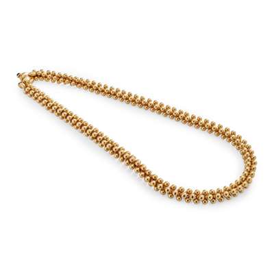 composed of beaded links, the clasp set with a cabochon sapphire, stamped 750