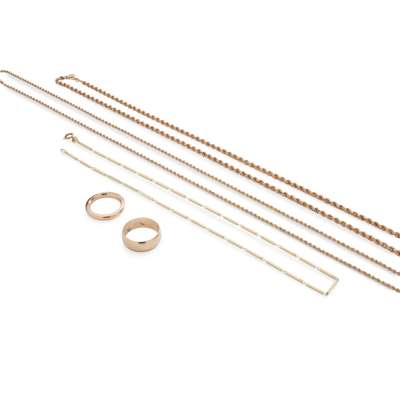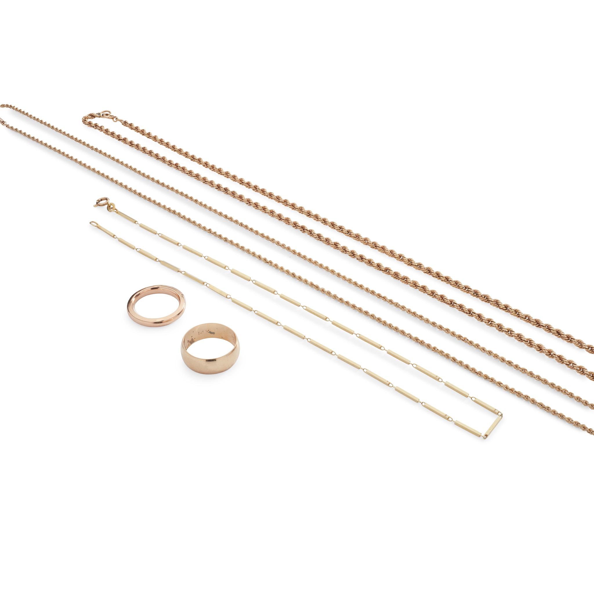 including two rope twist chains, unmarked; a bar link chain, stamped 585; a wedding band, stamped 14k; and another broad wedding band, unmarked