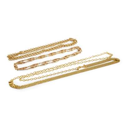 including a belcher link chain, unmarked; a lozenge-shaped link neck chain, unmarked; and a faceted link gilt-metal necklace