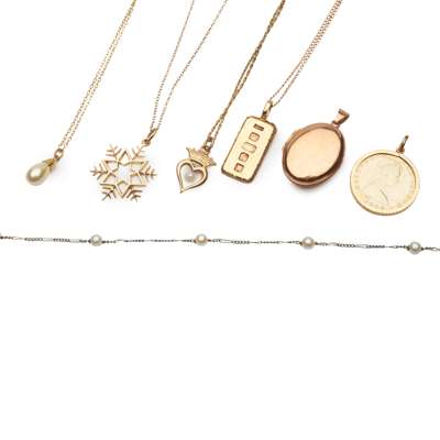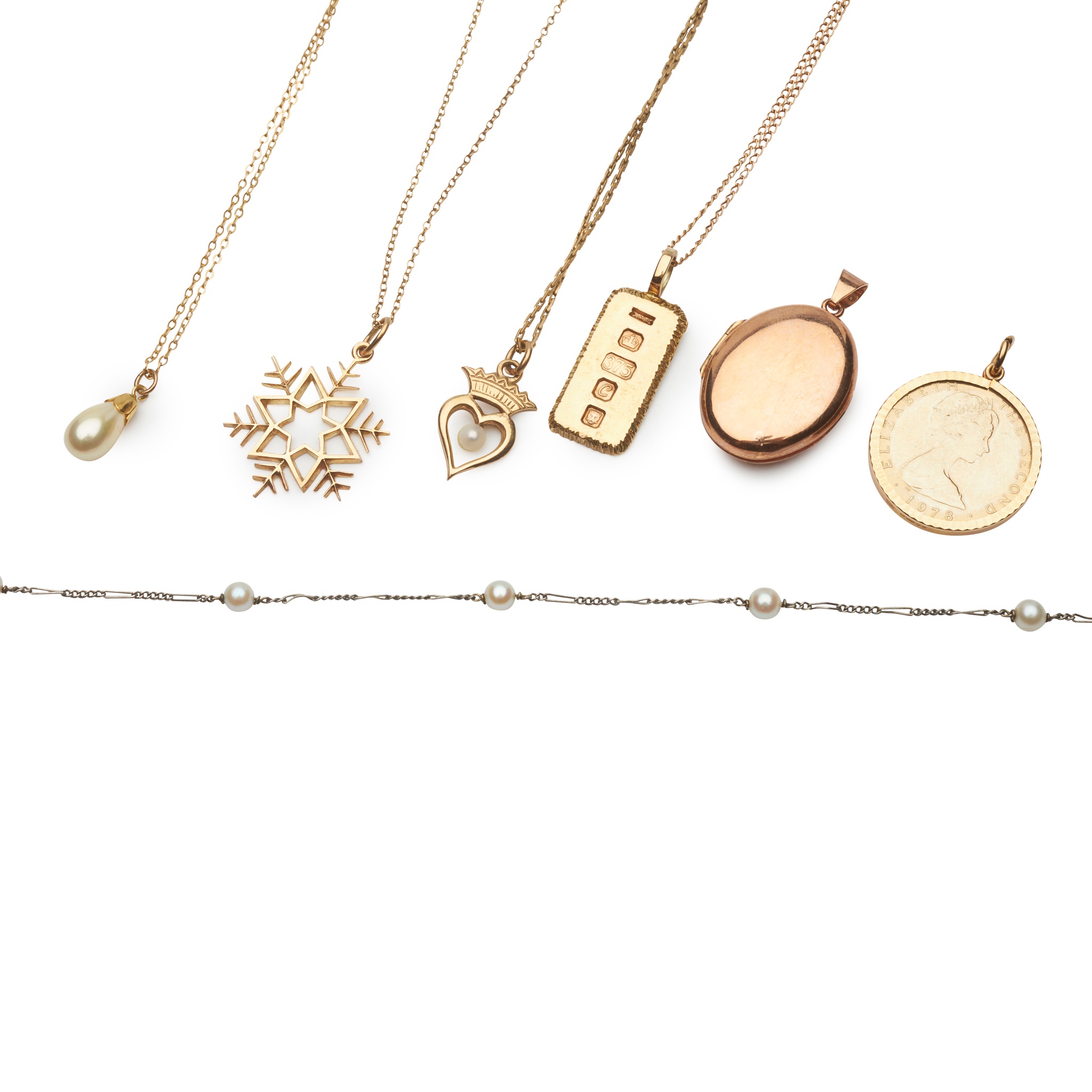 including a 9ct gold ingot pendant, to a trace link chain; an Isle of Man one pound coin in a 9ct gold mount; a 9ct gold cultured pearl heart-shaped pendant, a 9ct gold snowflake pendant, a 9ct gold locket and two cultured pearl set chains