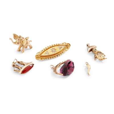 set with round brilliant-cut diamonds, beaded detail to the border, modelled in 15ct gold; together with a 9ct gold elephant pendant, a 9ct gold citrine and turquoise duck pendant; a 9ct gold carnelian set galleon pendant, and others