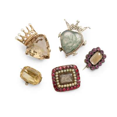 including a 9ct gold citrine and seed pearl crowned heart brooch, a silver and moss-agate crowned heart brooch; a small citrine brooch, two further gem-set brooches