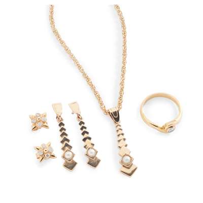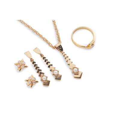 including an 18ct gold single-stone diamond ring, a pair of 18ct gold diamond cluster earrings; a 9ct gold pearl pendant necklace and matching earrings