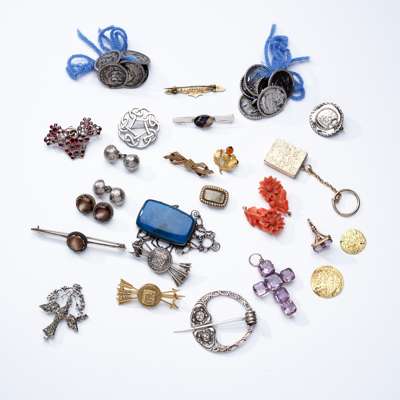 including an engraved unmarked rectangular locket, an amethyst cross pendant and a 9ct gold mounted amethyst seal; two coral brooches, modelled as sunflowers; two hammered Arabic coins, a collection of buttons and various silver or gem-set brooches