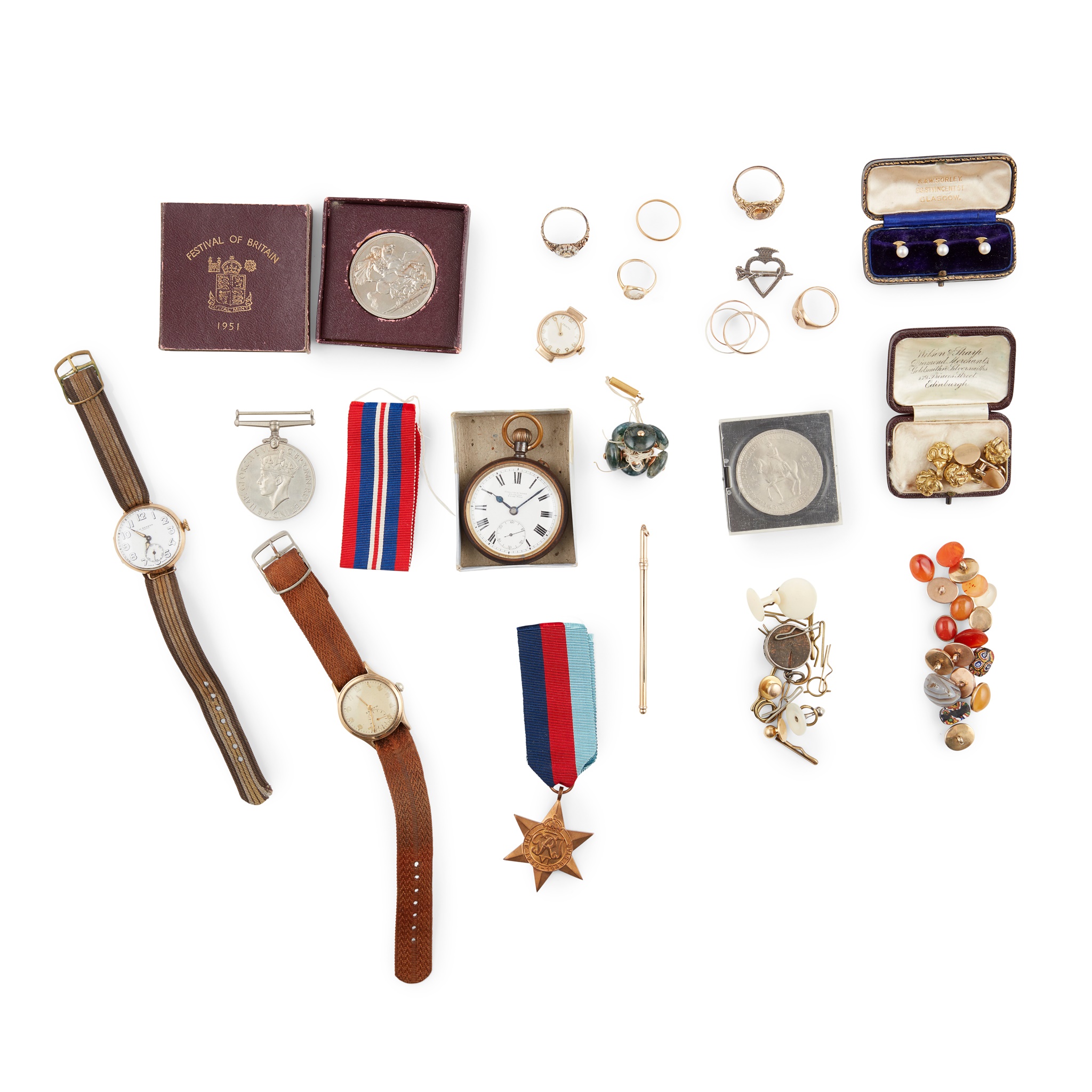 including a 9ct gold Russian wedding ring, a 9ct gold signet ring; a citrine and pearl cluster ring, a 22ct gold wedding band, a set of moss-agate buttons; various other rings, cufflinks, studs, watches etc.