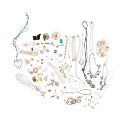 including a 9ct gold cameo brooch, a 9ct gold fern spray brooch; a scrolling gem-set brooch, indistinctly marked; a long strand of cultured pearls and a pair of matching stud earrings; various other necklaces, brooches, beads etc.