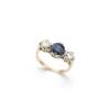 claw-set with a round-cut sapphire and two round brilliant-cut diamonds, to a plain band, unmarked