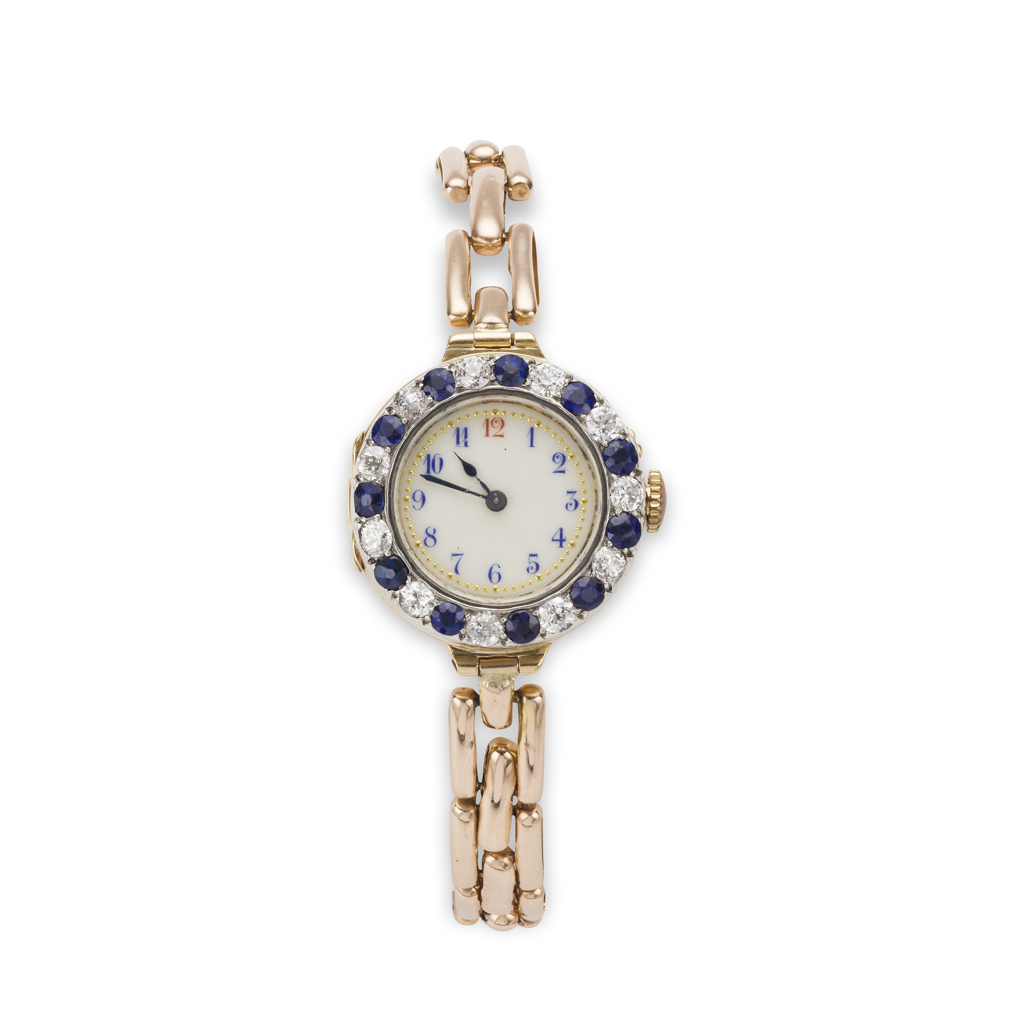 the white circular dial with blue and red Arabic numerals, bezel set with round-cut diamonds and sapphires, manual wind, engraved to reverse of the case; to a flexible-link bracelet