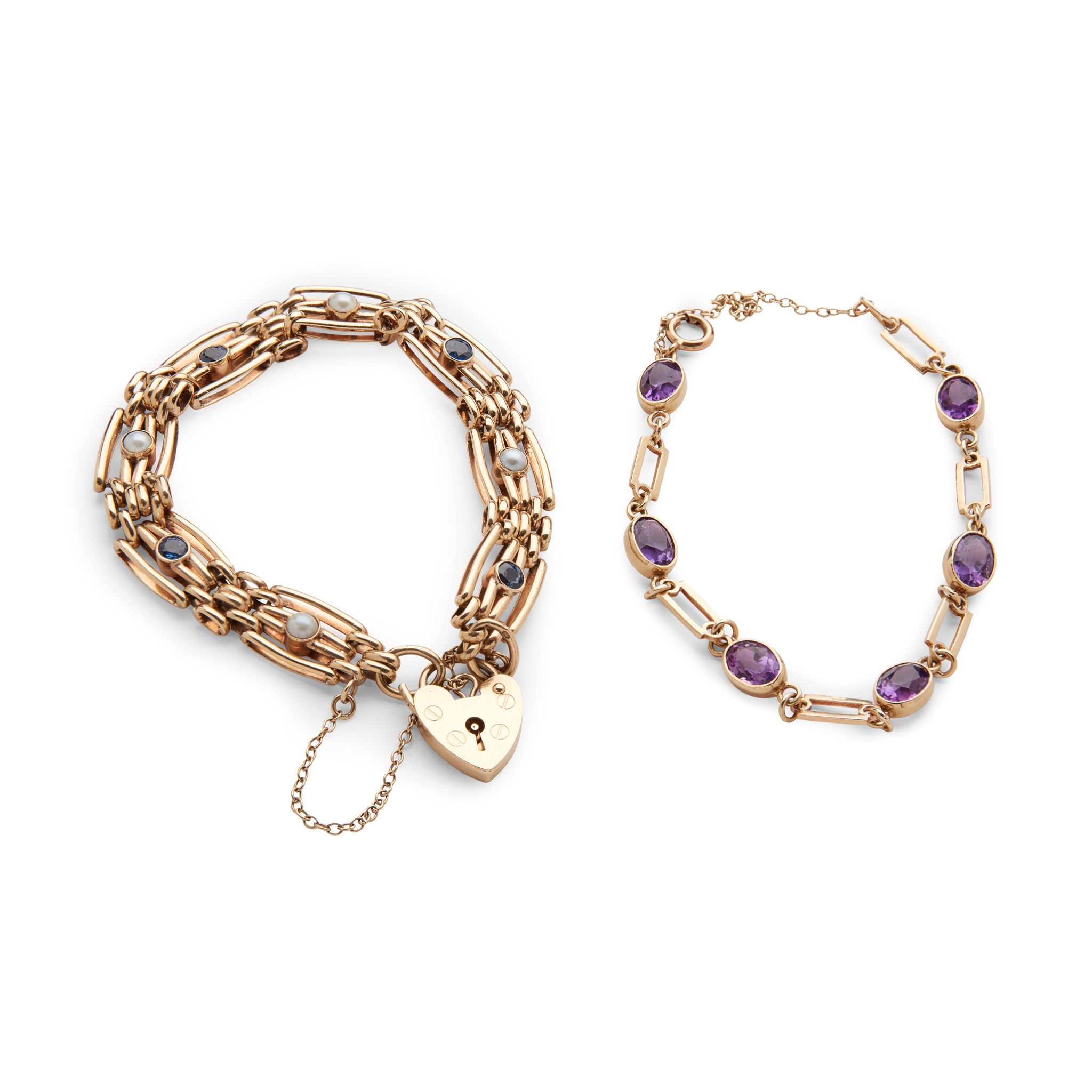 alternating with collet-set half-pearls and round-cut sapphires, modelled in 9ct gold; together with a collet-set amethyst bracelet, modelled in 9ct gold