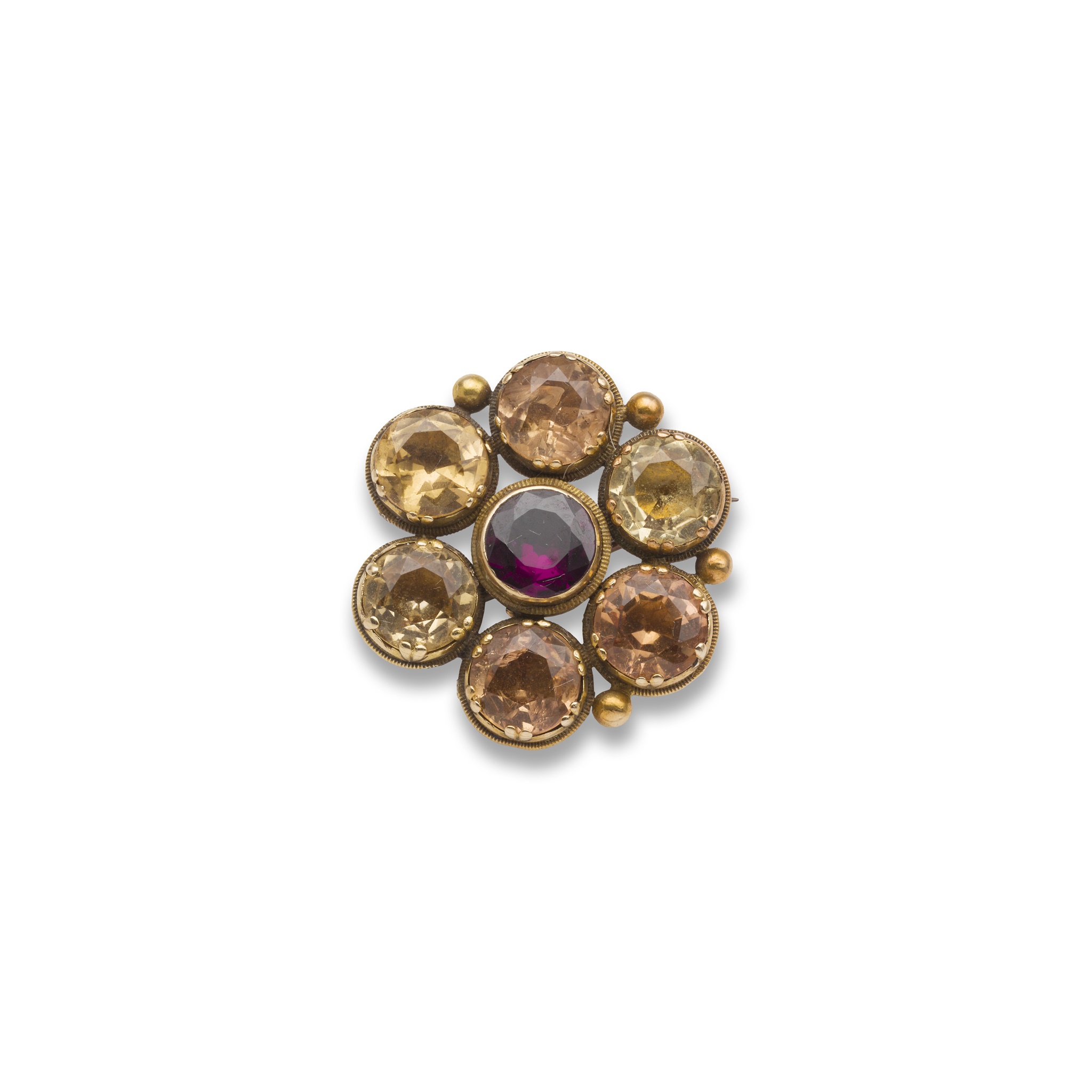 of floral design, millegrain-set with a central garnet and six citrines in closed-back settings, unmarked