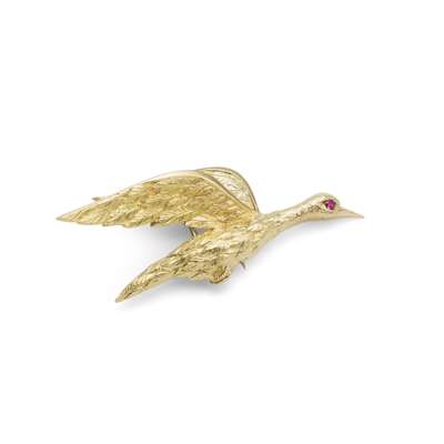 naturalistically modelled, set with a round-cut ruby eye, stamped 750