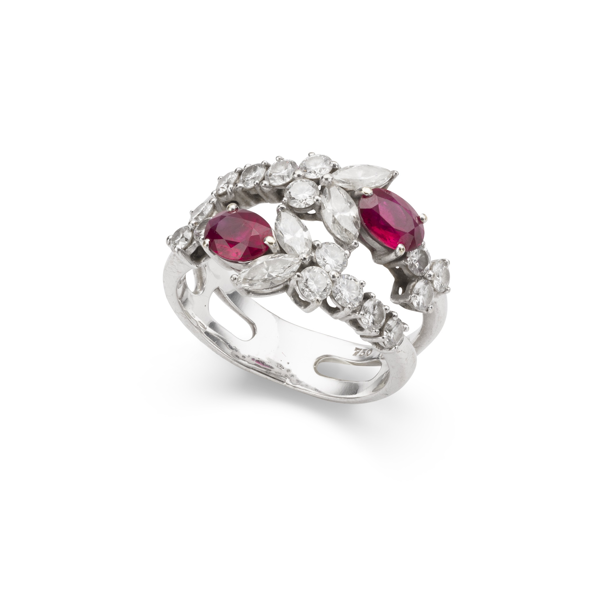 claw-set with two oval-cut rubies and various graduated round brilliant and marquise-cut diamonds, stamped 750