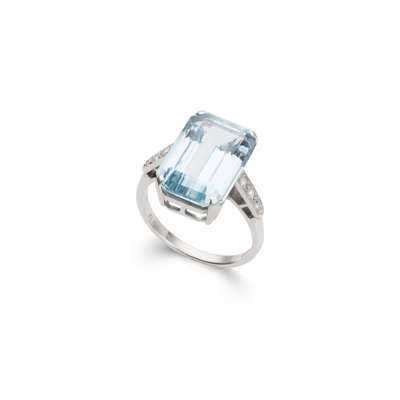 claw-set with a cut-cornered rectangular-cut aquamarine, each shoulder set with three eight-cut diamonds, to a plain band, stamped 18CT PLAT