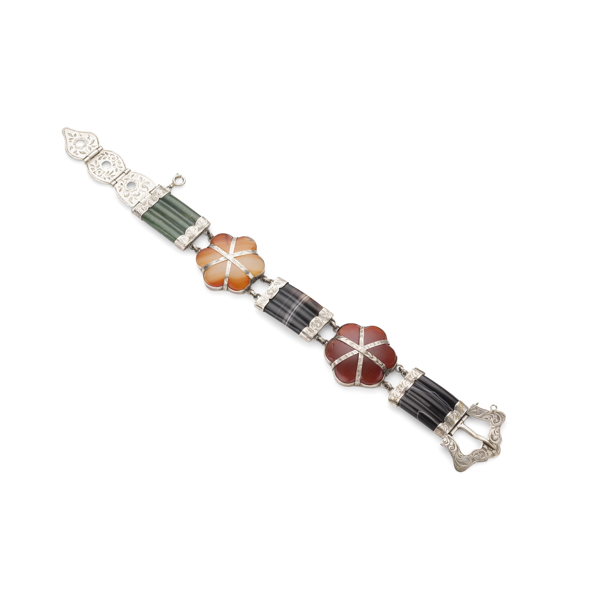 composed of various carved agate links, the clasp modelled as a buckle with engraved detail, unmarked