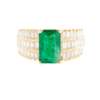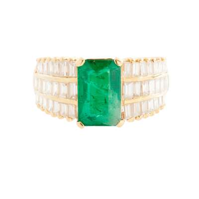 claw-set with a cut-cornered rectangular-cut emerald, each shoulder set with three rows of baguette-cut diamonds, stamped 750