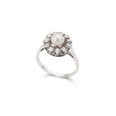 set with a central (untested) pearl in a border of old round-cut diamonds, to a plain band, unmarked