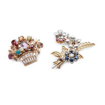 the first of giardinetto design, claw-set with various amethysts, garnets, citrines, peridots etc, modelled in 9ct gold; together with another modelled as a bouquet of flowers, set with round-cut sapphires, rubies and diamonds, unmarked