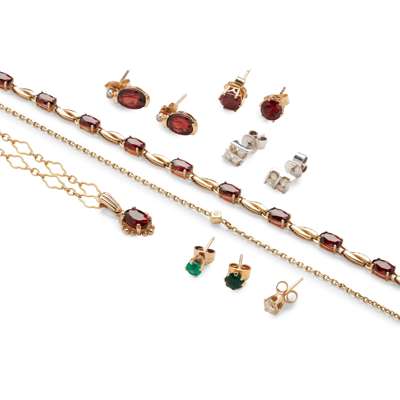 including a garnet bracelet, stamped 375; a 9ct gold garnet pendant to a fancy link chain, two pairs of garnet stud earrings; a trace-link bracelet set with a small round-cut diamond; a pair of diamond cluster earrings, unmarked; and other stud earrings