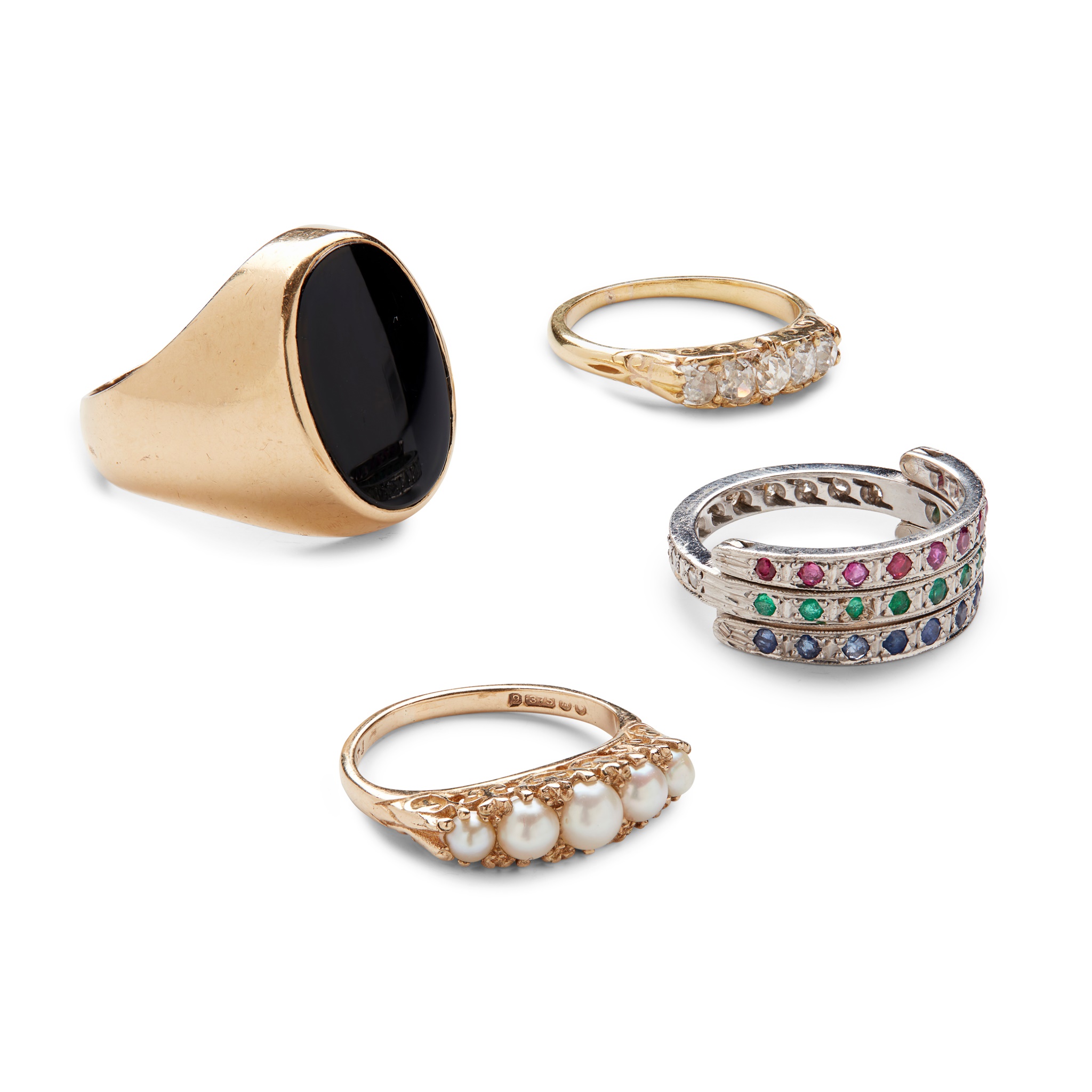 including a five-stone pearl ring, modelled in 9ct gold; a five-stone diamond ring, unmarked; a diamond, sapphire, ruby and emerald swivel ring, unmarked; and an onyx signet ring, stamped 750