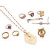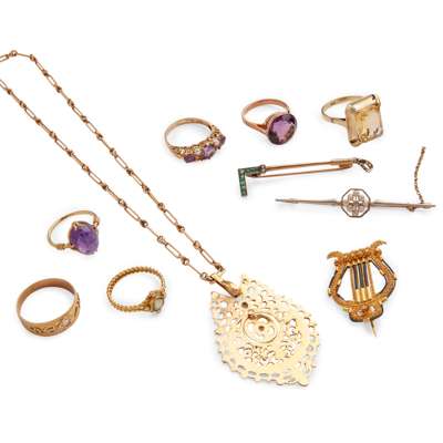 including an 18ct gold diamond set Miz-Pah ring, a peridot and seed pearl ring, unmarked; a 9ct gold amethyst and seed pearl ring, three further amethyst or citrine cocktail rings; an emerald and diamond brooch modelled as a polo mallet, unmarked; a diamond and seed pearl bar brooch, stamped 15ct; an unmarked brooch modelled as a lyre and a pierced unmarked pendant of stylized design