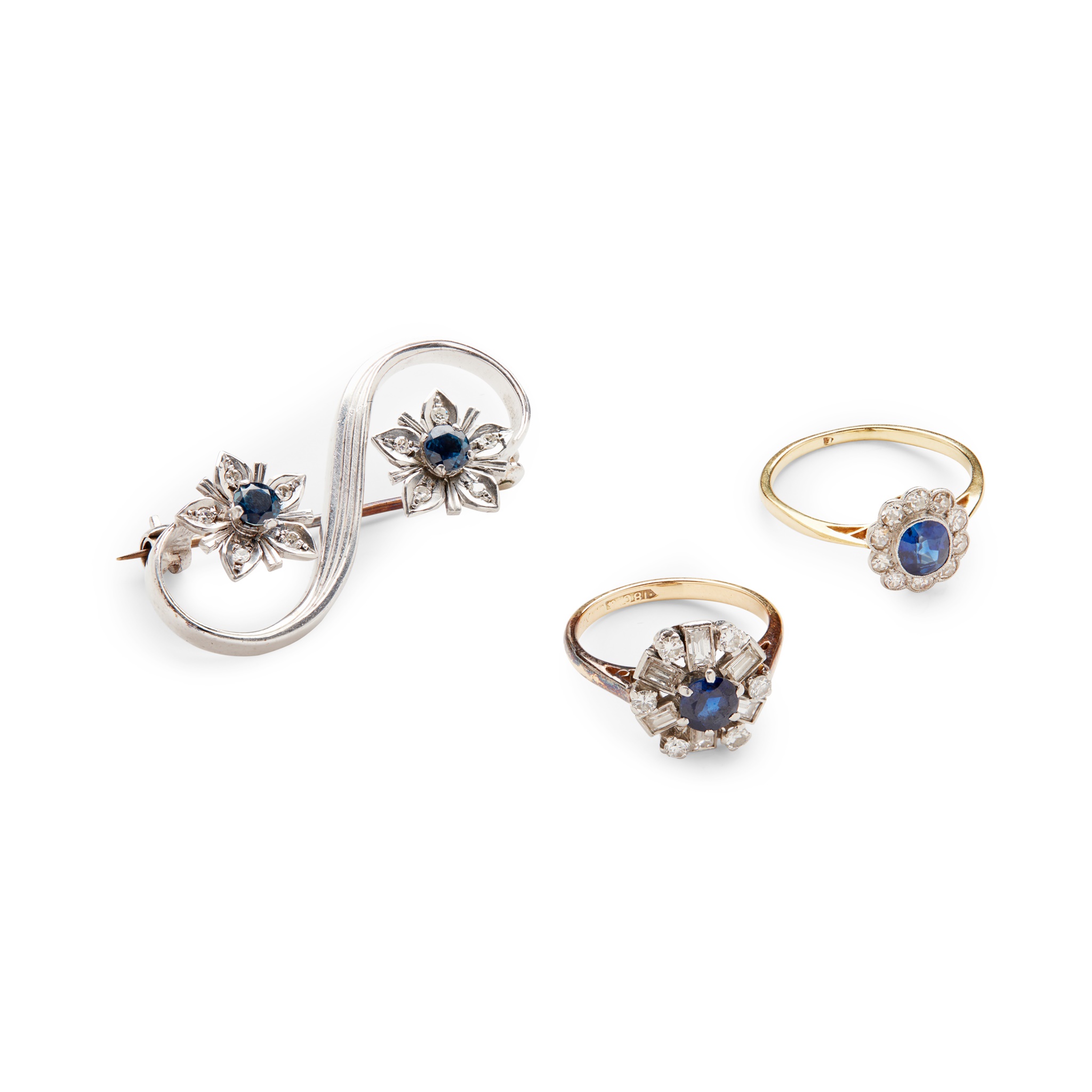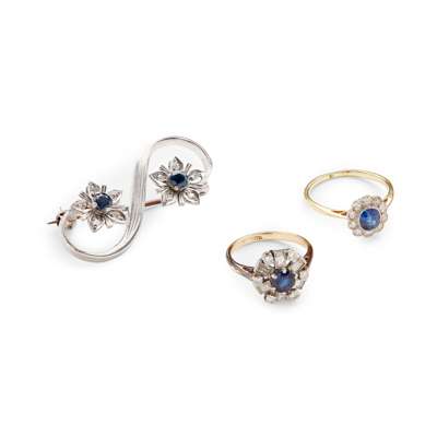 including a sapphire and diamond cluster ring, unmarked; a baguette and round brilliant-cut diamond and sapphire cluster ring, stamped 18ct; a 9ct gold sapphire and diamond floral brooch, by Hamilton & Inches