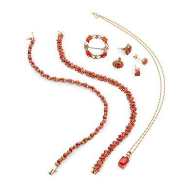 including a 9ct gold round and oval-cut fire opal bracelet; a 9ct gold pear-shaped fire opal bracelet; a 9ct gold fire opal brooch of circular outline, a pair of 9ct gold fire opal stud-earrings and another pair stamped 9ct; and a 9ct gold fire opal and diamond pendant, to a fancy link chain