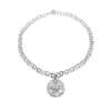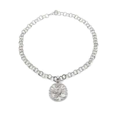 the necklace composed of engraved circular links, suspending a circular pendant with a stylized owl motif