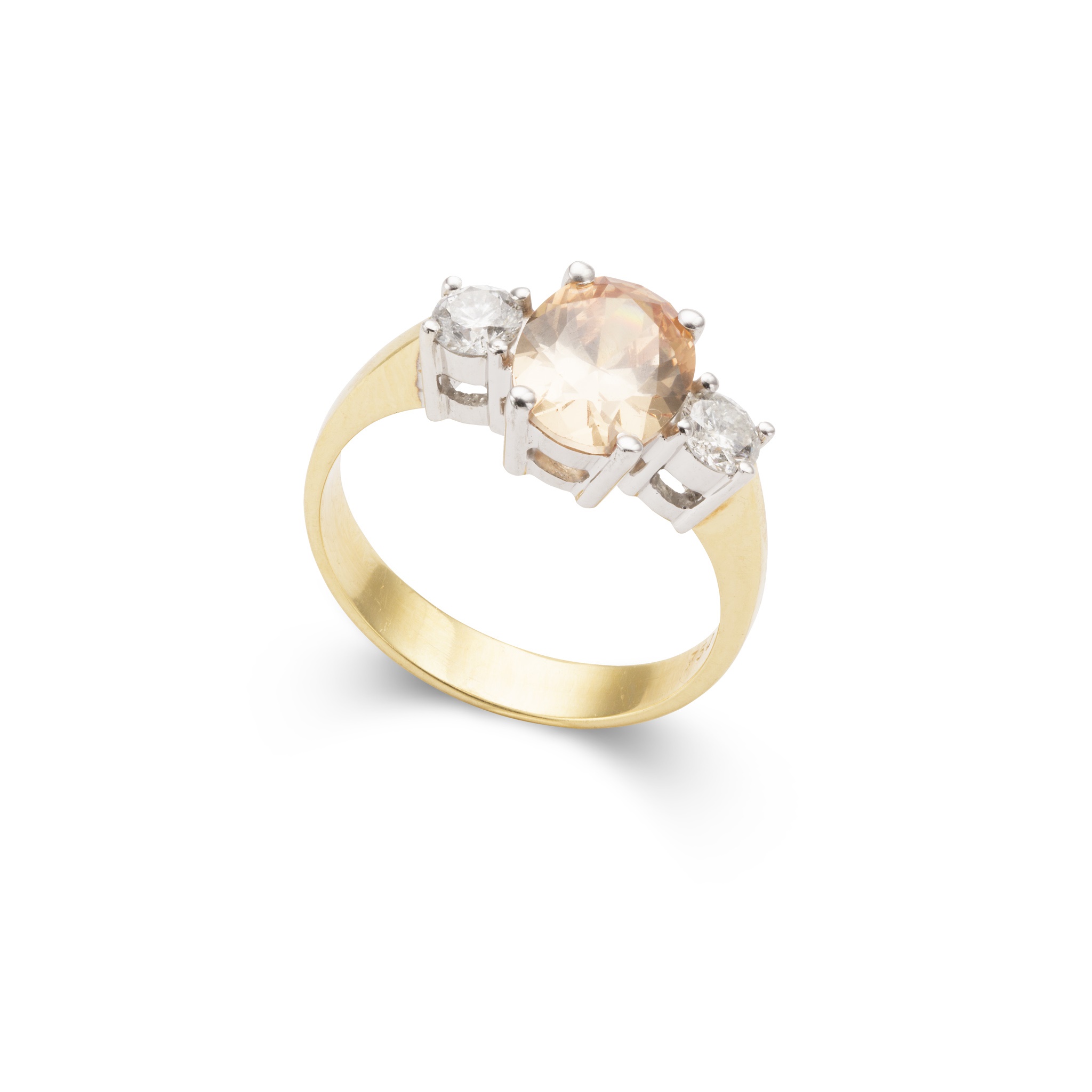 claw-set with an oval-cut pinkish-orange tourmaline and two round brilliant-cut diamonds, to a plain band, stamped 750