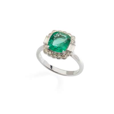claw-set with a cushion-cut emerald in a border of round brilliant and baguette-cut diamonds, stamped 750