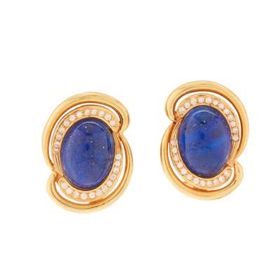 each collet-set lapis lazuli cabochon in a scrolling border of round brilliant-cut diamonds, post and clip fittings, stamped 750