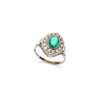 collet-set with an oval-cut emerald in a border of old-cut diamonds, pierced scrolling detail to gallery and shoulders, indistinctly marked